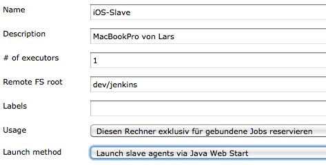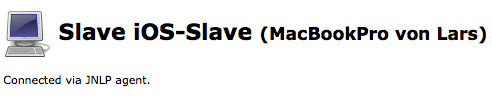 In case you used a different name in the node configuration of the master you just have to replace "iOS-Slave" in the above url. You can always get the correct jnlpUrl from the properties of your node in the Jenkins master (see: "Manage Jenkins/Manage Nodes/node_name").