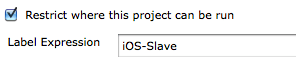 For all your iOS builds it's recommended to bind the build job to the iOS-Slave node you created earlier. To do this choose the option "Restrict where this project can be run" from the properties of the build and enter the name of the iOS node in the field "Label Expression":