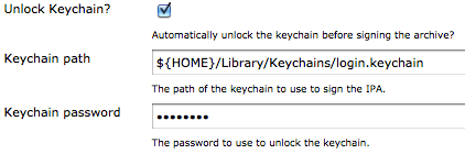 After that please make sure the plugin is able to access the keychain on the slave. Therefore you have to check the option "Unlock Keychain" and specify the path to the keychain file and your password: