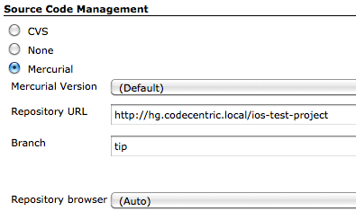 Next step is to configure the properties of your source code repository in the "Source Code Management" section. Please keep in mind that the client running MacOS needs to be able to access the specified repository and make sure all required login credentials are provided.